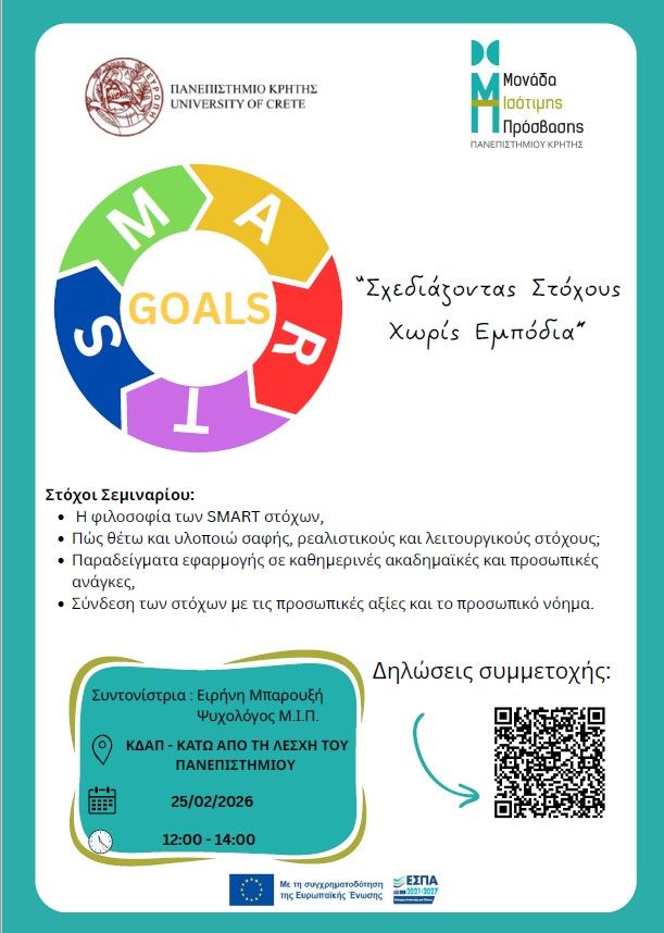 Το σεμινάριο «Σχεδιάζοντας SMART Στόχους χωρίς Εμπόδια» προσφέρεται από τη Μονάδα Ισότιμης Πρόσβασης Ατόμων με Αναπηρία & Ατόμων με Ειδικές Εκπαιδευτικές Ανάγκες (Μ.Ι.Π.) του Πανεπιστημίου Κρήτης και έχει στόχο να παρουσιάσει έναν απλό και πρακτικό τρόπο διαμόρφωσης στόχων, που μπορεί να εφαρμοστεί στη φοιτητική καθημερινότητα.