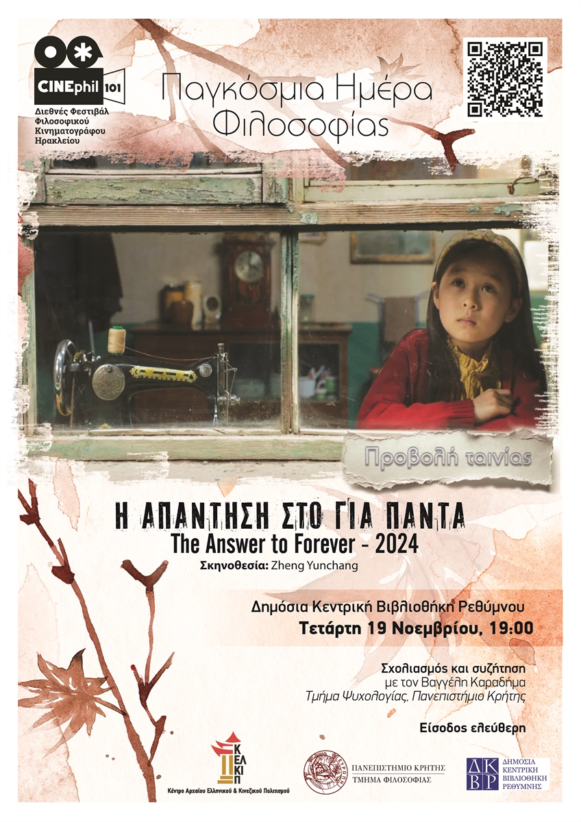 Την Τετάρτη 19 Νοεμβρίου, στις 19:00, στη Δημόσια Βιβλιοθήκη Ρεθύμνου θα προβληθεί η βραβευμένη ταινία «Η απάντηση στο για πάντα» (The answer to forever, 2024, 83’) του Κινέζου σκηνοθέτη Zheng Yunchang, με ελληνικούς και αγγλικούς υπότιτλους. Θα ακολουθήσει σχολιασμός από τον Βαγγέλη Καραδήμα, Καθηγητή στο Τμήμα Ψυχολογίας του Πανεπιστημίου Κρήτης, και συζήτηση με το κοινό. Παράλληλα, στο φουαγιέ θα λειτουργεί έκθεση ελληνικών βιβλίων για την κινεζική φιλοσοφία.