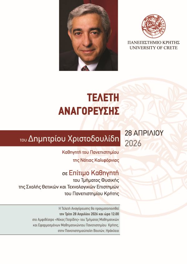 Η αναγόρευση του Τιμώμενου θα πραγματοποιηθεί από τον Πρύτανη του Πανεπιστημίου Κρήτης  Καθηγητή Γεώργιο Μ. Κοντάκη,  την Τρίτη 28 Απριλίου 2026 και ώρα 12:00, στο Αμφιθέατρο «Νίκος Πετρίδης» του Τμήματος Μαθηματικών και Εφαρμοσμένων Μαθηματικών του Πανεπιστημίου Κρήτης, στην Πανεπιστημιούπολη Βουτών, στο  Ηράκλειο.