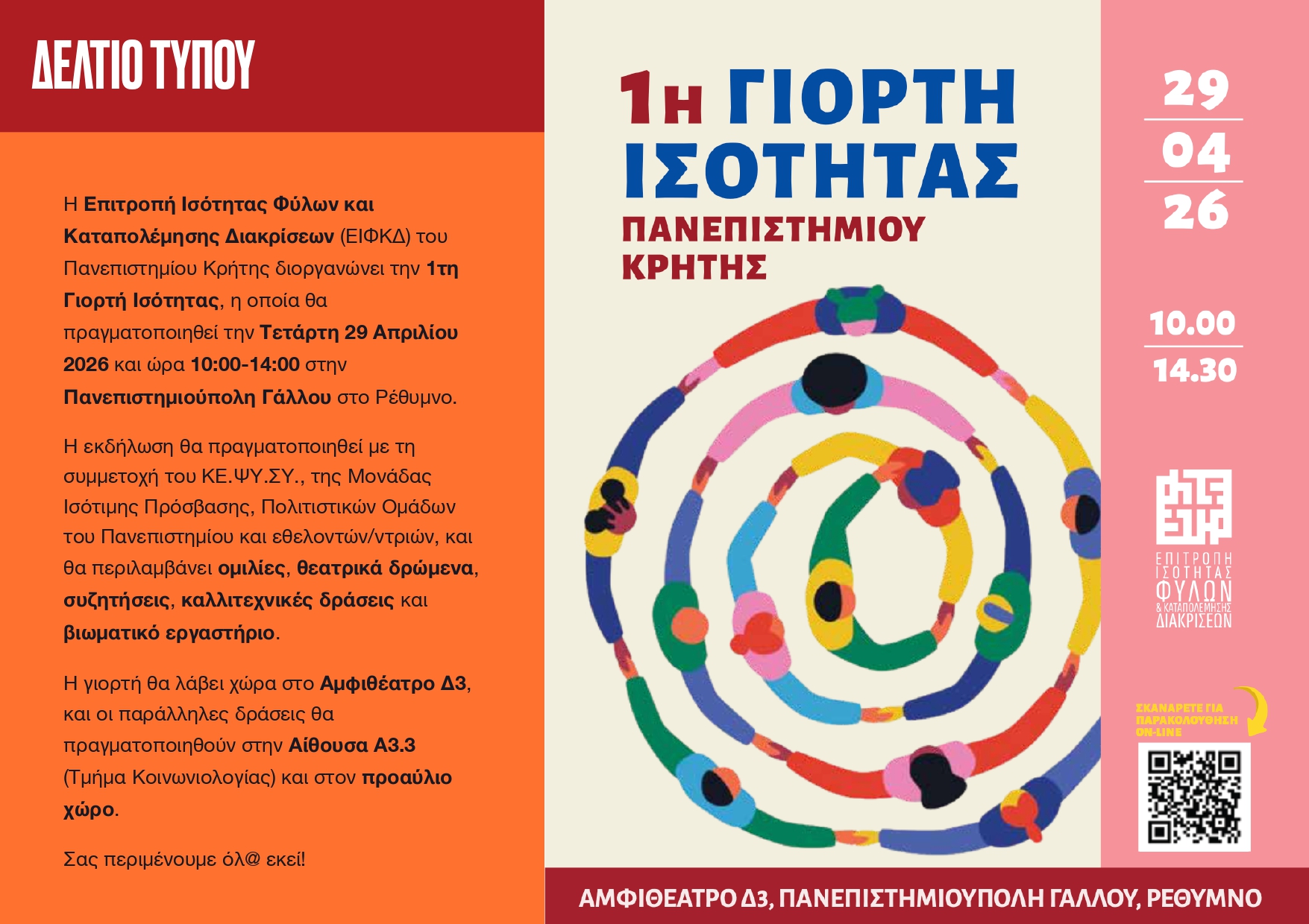 Η Επιτροπή Ισότητας Φύλων και Καταπολέμησης Διακρίσεων (ΕΙΦΚΔ) του Πανεπιστημίου Κρήτης διοργανώνει την 1η Γιορτή Ισότητας. Η εκδήλωση θα πραγματοποιηθεί την Τετάρτη 29 Απριλίου 2026, από τις 10:00 έως τις 14:30. Ο κύριος χώρος διεξαγωγής θα είναι το Αμφιθέατρο Δ3 στην Πανεπιστημιούπολη Γάλλου στο Ρέθυμνο.