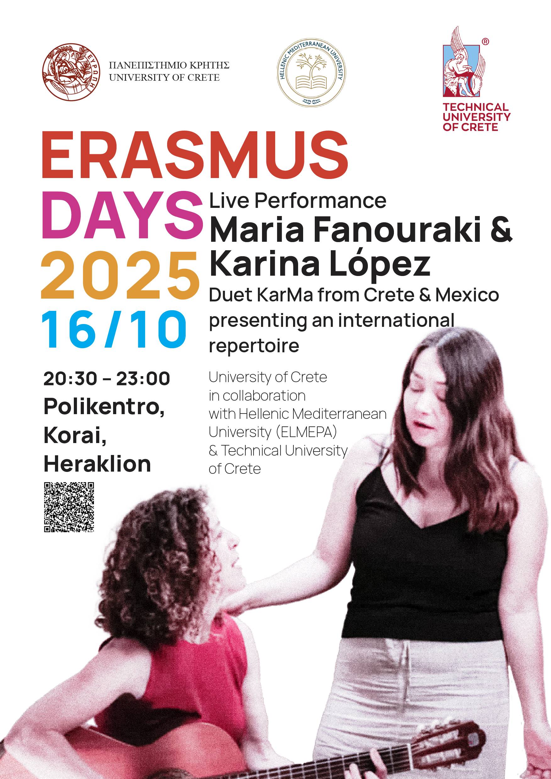 - Πέμπτη 16/10, 20:30 – 23:00, Ηράκλειο: Μουσική εκδήλωση με το ντουέτο “KarMa” (Μαρία Φανουράκη & Karina López) από την Κρήτη και το Μεξικό, που θα παρουσιάσει ένα διεθνές ρεπερτόριο. Η εκδήλωση θα λάβει χώρα στο Πολύκεντρο Νεολαίας (Κοραή).