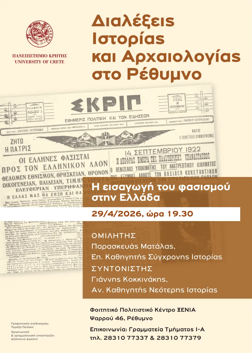 Η τρίτη διάλεξη του κύκλου «Διαλέξεις Ιστορίας και Αρχαιολογίας στο Ρέθυμνο», που διοργανώνει το Τμήμα Ιστορίας και Αρχαιολογίας Πανεπιστημίου Κρήτης, θα πραγματοποιηθεί την Τετάρτη 29 Απριλίου 2026, στις 19:30, στο Φοιτητικό Πολιτιστικό Κέντρο Ξενία. Η διάλεξη έχει θέμα «Η εισαγωγή του φασισμού στην Ελλάδα» και ομιλητή τον Παρασκευά Ματάλα, Επίκουρο Καθηγητή Σύγχρονης Ιστορίας, ενώ τη συζήτηση θα
