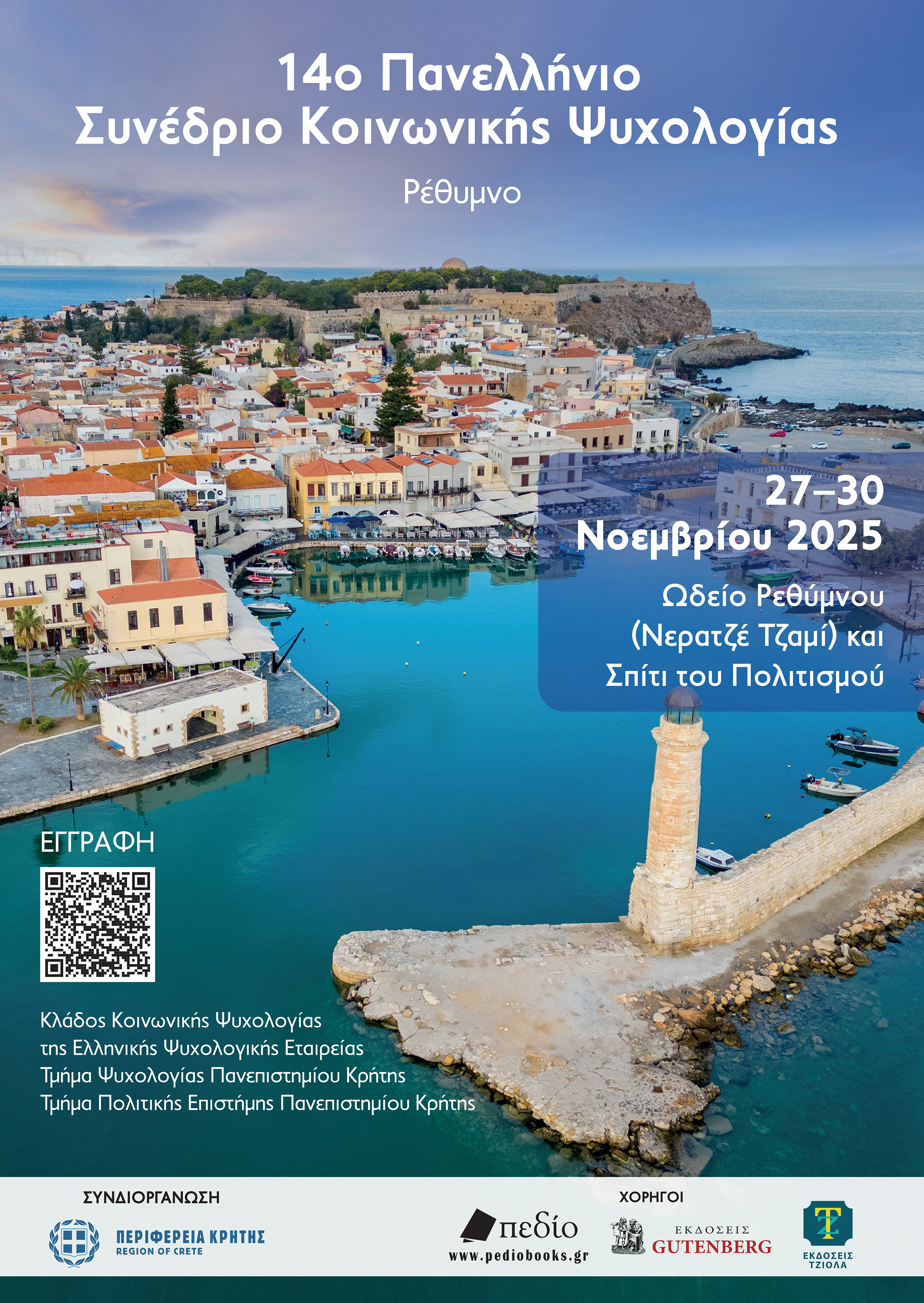Τα Τμήματα Ψυχολογίας και Πολιτικής Επιστήμης του Πανεπιστημίου Κρήτης και ο Κλάδος Κοινωνικής Ψυχολογίας της Ελληνικής Ψυχολογικής Εταιρείας συνδιοργανώνουν το 14ο Πανελλήνιο Συνέδριο Κοινωνικής Ψυχολογίας στο Ωδείο Ρεθύμνου, στις 27-30 Νοεμβρίου 2025, υπό την αιγίδα της Περιφέρειας Κρήτης. Πρόκειται για το τακτικό συνέδριο του Κλάδου Κοινωνικής Ψυχολογίας της ΕΛΨΕ, το οποίο καλύπτει το σύνολο των βασικών πεδίων έρευνας και θεωρίας στον συγκεκριμένο επιστημονικό κλάδο, όπως τις διομαδικές και διαπροσωπικές σχέσεις, τις κοινωνικές στάσεις και αξίες, την κοινωνική επιρροή, κ.α. Το πλήρες πρόγραμμα του συνεδρίου βρίσκεται εδώ.