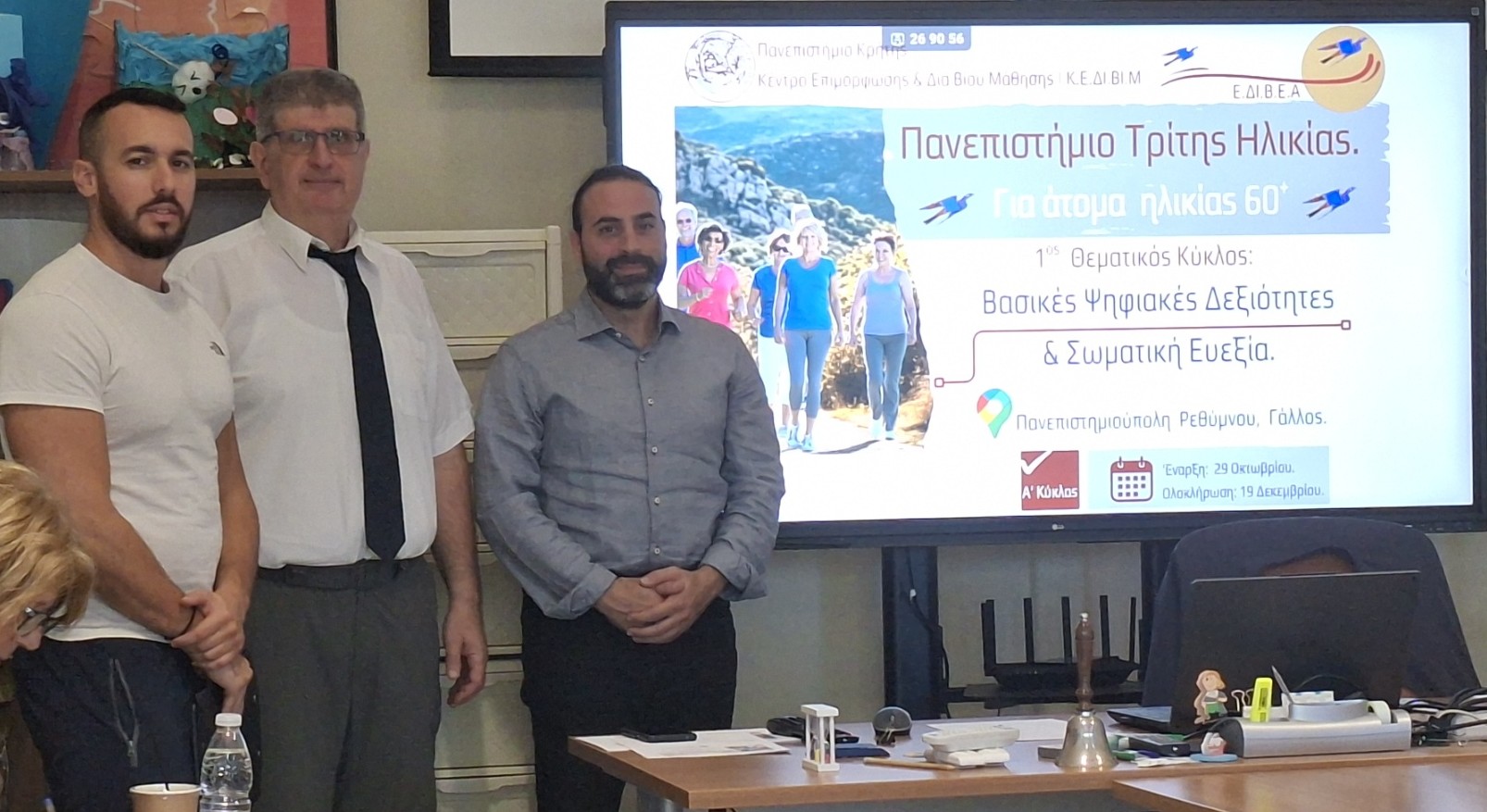 Ξεκίνησαν στις 29.10.2025 και ώρα 9.00 π.μ το “Πανεπιστήμιο 3ης Ηλικίας” φορέας υλοποίησης του οποίου είναι το ΚΕ.ΔΙ.ΒΙ.Μ του Πανεπιστημίου Κρήτης, και το Ε.ΔΙ.Β.Ε.Α του Παιδαγωγικού Τμήματος Δ.Ε.